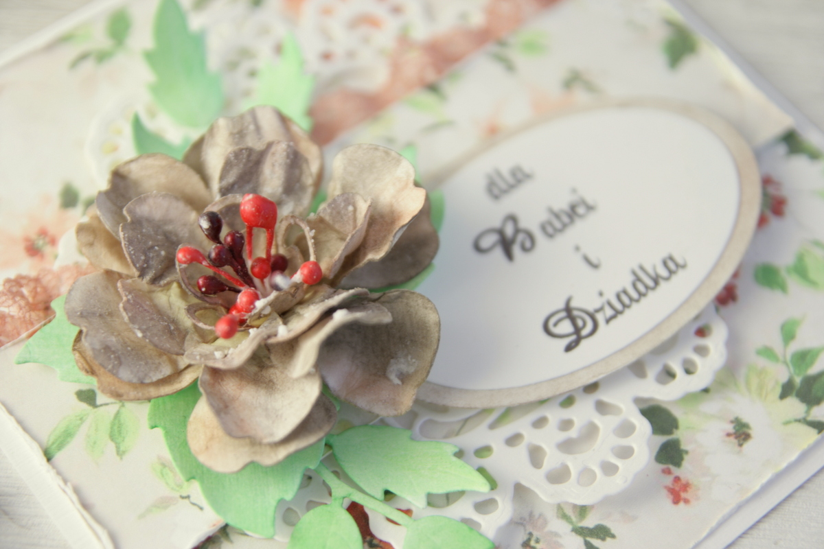 Dwie kolejne kartki z okazji Dnia Babci i Dziadka. Nie mogło zabraknąć kwiatów, przedarć i ażurowych serwetek :)